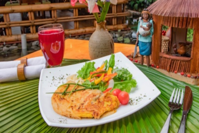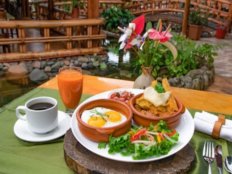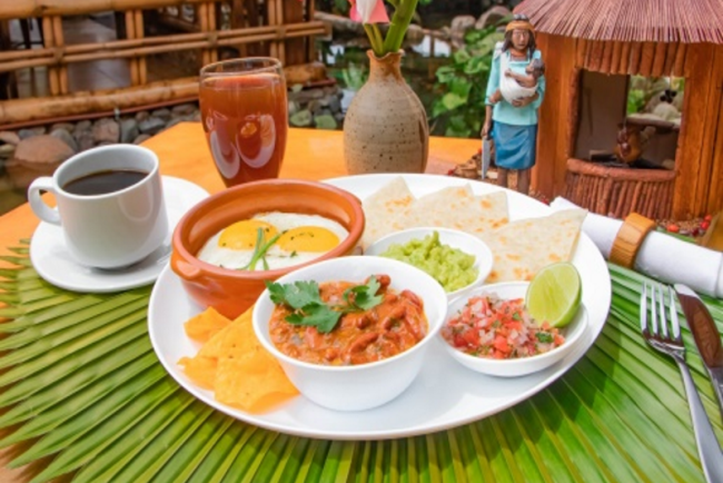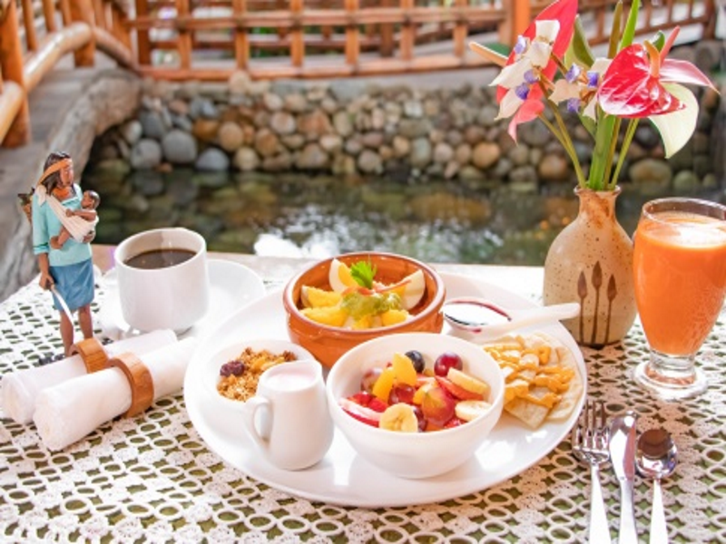 Pancakes con fruta frutilla, uva, banano, kiwi, acompañado de huevos revueltos con jamón, batido de leche con fruta.